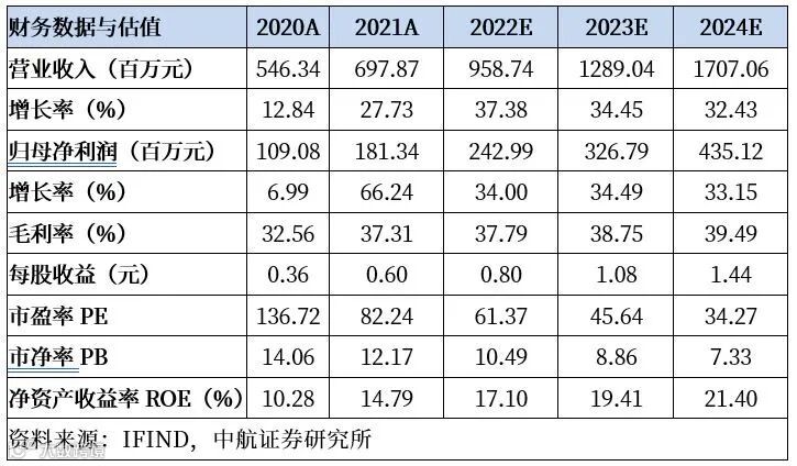 基于以上观点,我们预计公司2022-2024年的营业收入分别为9.59亿元、12.89亿元和17.07亿元,归母净利润分别为2.43亿元、3.27亿元及4.35亿元,EPS分别为0.80元、1.08元、1.44元;我们维持买入评级。
