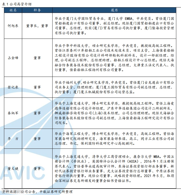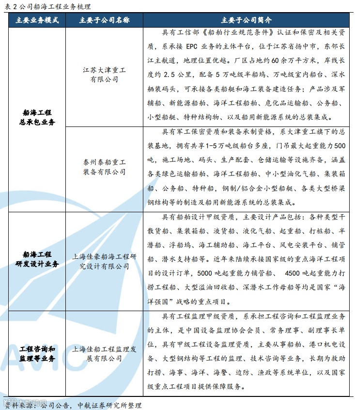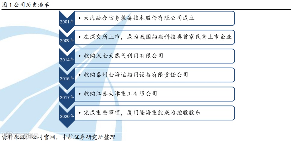 依托自身行业优势,整合子公司优质资源。公司前身是上海佳豪船舶设计有限公司,主要从事船舶设计与监理业务,于2011年收购佳豪物流;2013年,公司定增收购上海沃金天然气有限公司,进军天然气市场;2015年,收购金海运船用装备有限公司,进军防务装备市场;2017年收购大津重工,加强公司船海工程、清洁能源、军民融合等板块之间的业务联系;公司曾在2018年遭遇流动性危机,于2020年引入厦门隆海重整投资人,同年底完成重整事项;2021年公司收购南华工业部分股权,开始在舰船智能化领域积极布局。