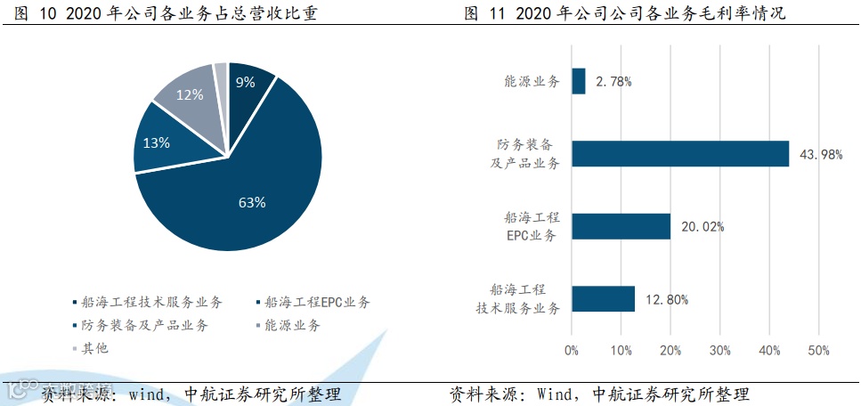 船海工程仍是主要收入来源,军品业务利润率高。公司重整后,将主营业务调整为船海工程、防务装备、新能源三大方向,2020年度占营收比例分别为72.21%、13.01%、12.28%。其中,军品业务毛利率达到43.98%,船海工程EPC业务和技术服务毛利率分别为20.02%和12.8%。公司通过不断发挥优势、整合资源、形成合力,构建“一总部三平台”的业务架构为公司重整风帆再出发打下坚实基础。