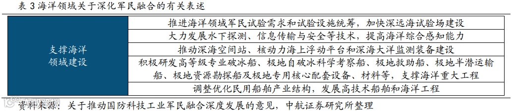 军民融合、混合所有制、军品定价议价机制等改革将逐步驱动企业走向自主科技创新的道路。近年来,民参军相关政策陆续出台,包括国家层面、部委层面、军工层面及地方政府层面的相关内容。工信部、发改委等部门的政策指出,要全面掌握船舶动力、甲板机械、舱室设备、通导与智能系统及设备的核心技术。相较于民用船舶建造,军用舰船建造技术难度大,技术含量高,进一步加强船舶军转民、军民两用技术科研工作,支持军民技术双向转移转化。国家对于军舰技术研发的大力投入,将进一步对民船发展与市场竞争创造条件,军民两用技术的研发已成为行业趋势所向。