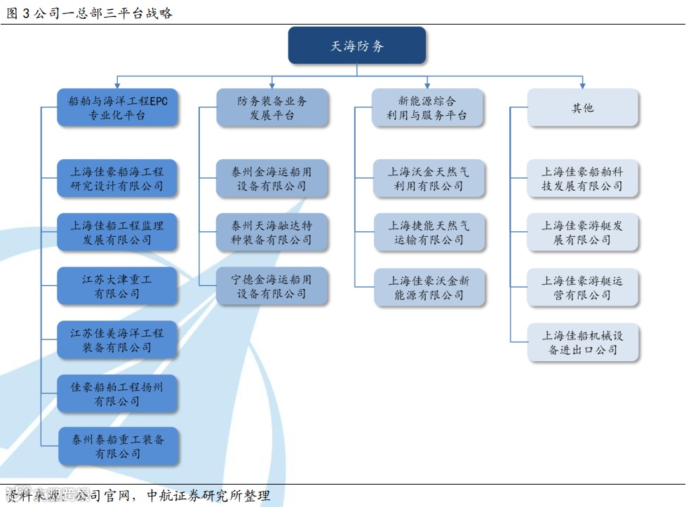 确立“一总部、三平台”的业务架构。公司经过重整后,重新梳理了目前公司旗下的业务条线,确立了“一总部、三平台”的业务架构,即以天海防务总部为核心,聚焦船海工程EPC专业化平台、防务装备业务发展平台以及新能源利用与服务平台,分别对应三家子公司,即大津重工有限公司、金海运船用设备有限责任公司和沃金天然气利用有限公司。公司业务目前涵盖船海工程研发设计、船海和港口机械工程技术咨询和监理、船舶和海洋工程总装制造、船舶和船用设备进出口、军辅船和军贸船设计建造、特种防务装备及配套产品研制、新能源应用技术研发和系统集成、天然气车加注站点建设和运营、天然气工业用户供应、合同能源管理、能源贸易等。