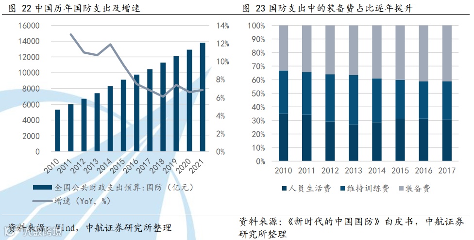 海洋防务装备快速发展,受益于军工行业高景气。近年来,中国国防预算持续保持中高速增长。2021年我国的国防支出预算为13795.44亿元,同比增长6.8%。我国国防军费开支主要用于四大细分领域:加大武器装备建设投入、改善训练条件、保障军队改革、官兵福利待遇。其中,加大武器装备建设处于首要位置,加上我国主战装备处于换装周期,各先进武器处于量产加速阶段,有望持续牵引产业链的高景气度发展。作为维护国家主权安全和发展利益的主体,海军是国防力量不可或缺的部分,从各类舰艇建造下水数量看我国海军已进入快速发展期。同时,造船具备建设空间广阔和周期较长的特点,行业高景气将长期可持续。