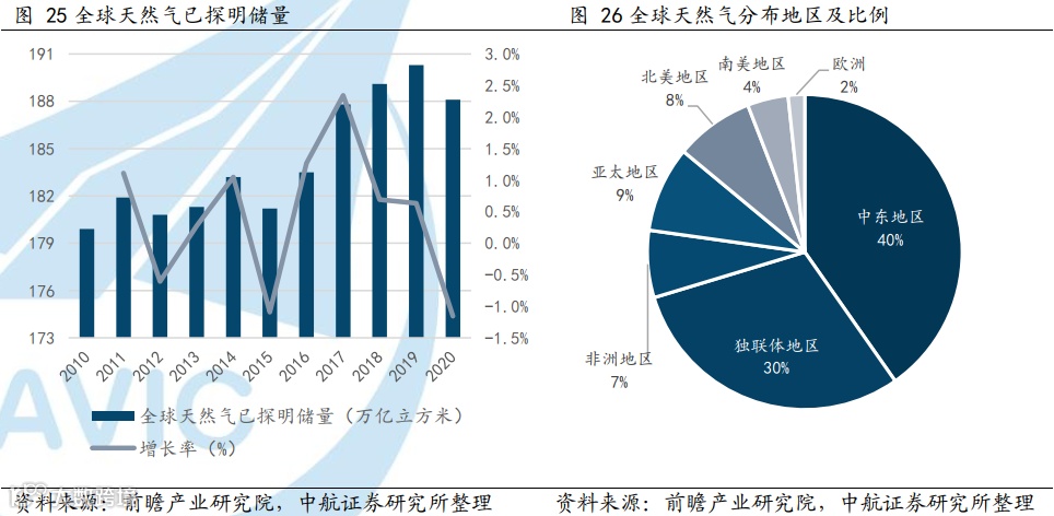 全球天然气已探明储量呈上行趋势,地理分布不均匀。天然气是各种替代燃料中最早广泛使用的一种,分为压缩天然气(CNG)和液化天然气(LNG)两种。在全球天然气储量勘探方面,全球天然气已探明储量在近十年来整体呈现震荡上行趋势。2019年,全球已探明天然气储量达190.3万亿立方米,创历史新高;2020年受全球疫情影响,世界经济衰退,天然气公司的资本投入下降导致探明资源储备受到影响,全球已探明天然气储量下降至188.1万亿立方米。从地区构成来看,目前,中东和独联体(CIS)地区已探明天然气储量稳居全球前二,占全球已探明储量的比重接近七成。2020年,中东地区已探明天然气储量为75.8万亿立方米,占全球总量的40.3%;独联体(CIS)地区已探明天然气储量为56.6亿立方米,占全球总量的30.1%。