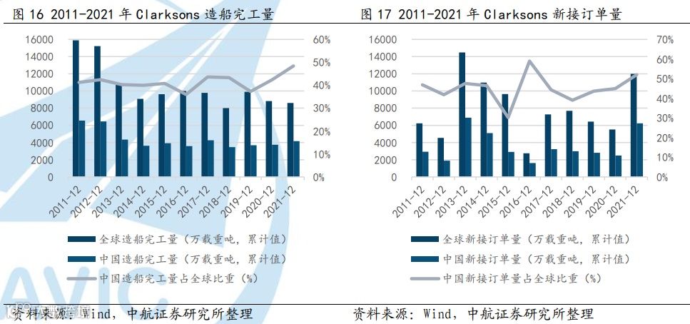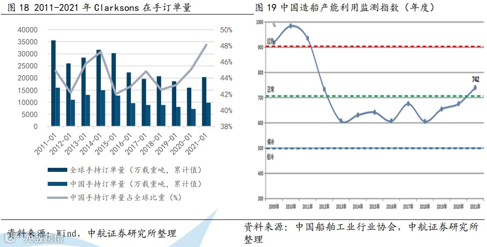 航运和造船业整体信心提振、产能充足。2021年中国造船产能利用监测指数(CCI)为742点,与2020年相比提高64点,同比增长9.4%,自2012年以来首次回升至正常水平线以上。去年四季度,国际航运市场高位震荡回落,新船价格指数惯性上涨,重点监测造船企业手持订单充足,生产任务饱满,但企业效益同比下降。年末CCI回落至742点,环比下降10点,保持在正常区间。虽然外部环境更趋复杂严峻,但航运和造船行业信心已经得到明显提振,加上国际海事环保新法规即将生效和去碳化需求带来的市场机会,全球新船订造需求不会大幅萎缩,仍将保持一定规模。中国船舶工业行业协会预测2022年CCI将继续保持在正常区间波动。