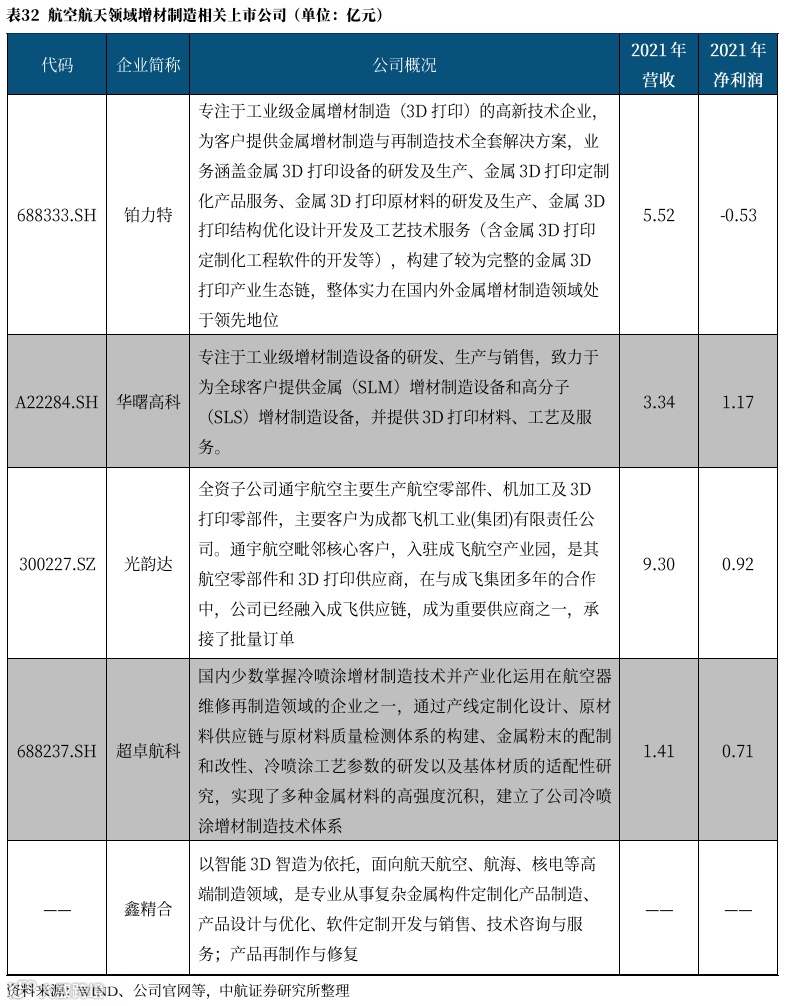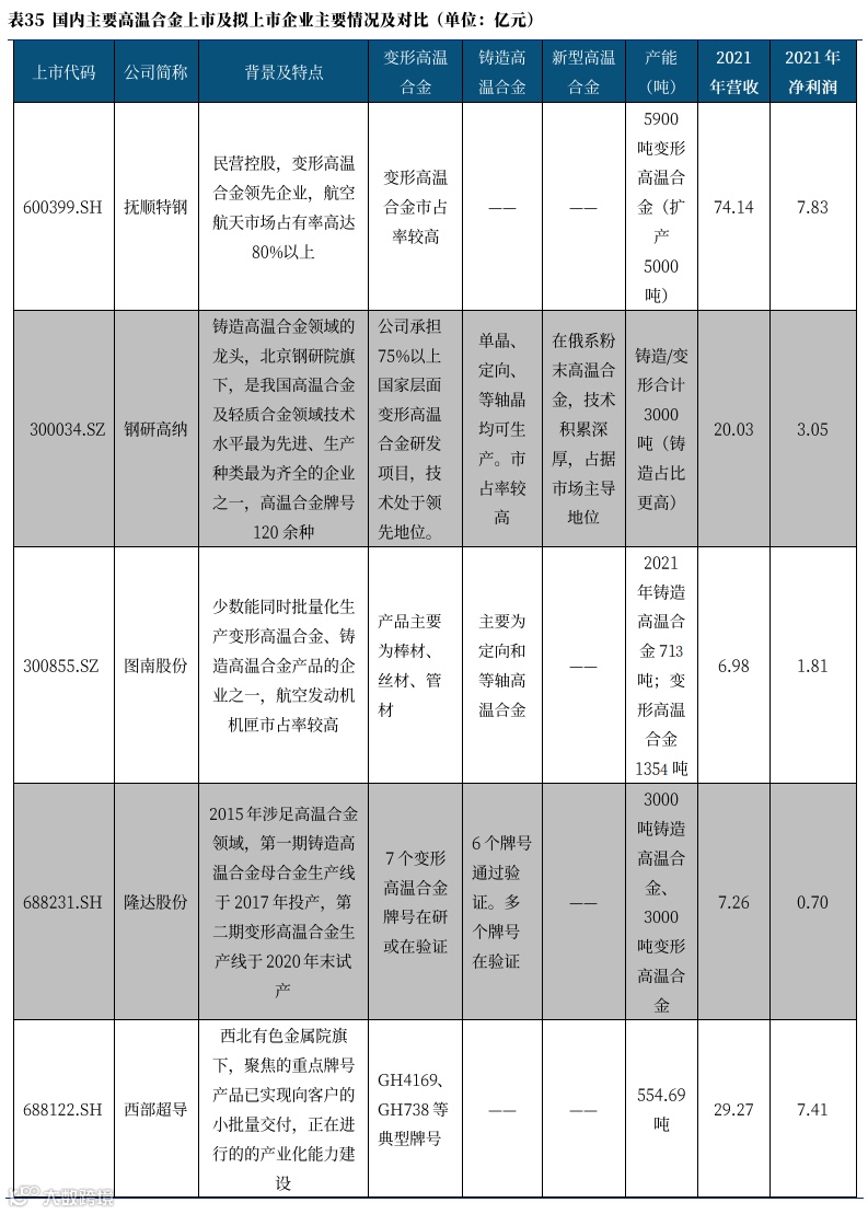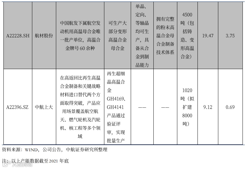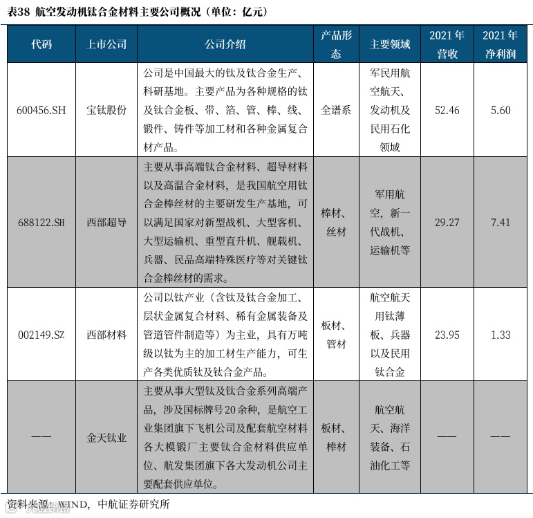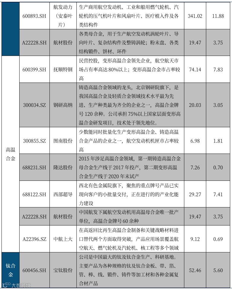 相关上市公司:钢研高纳(300034.SZ)、西部超导(688122.SH)、宝钛股份(600456.SH)、华秦科技(688281.SH)、航亚科技(688510.SH)、应流股份(603308.SH)、万泽股份(000534.SZ)、铂力特(688333.SH)等