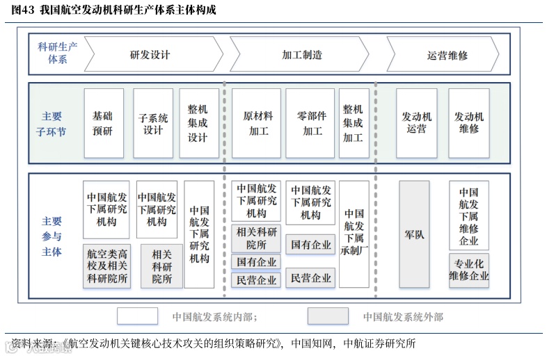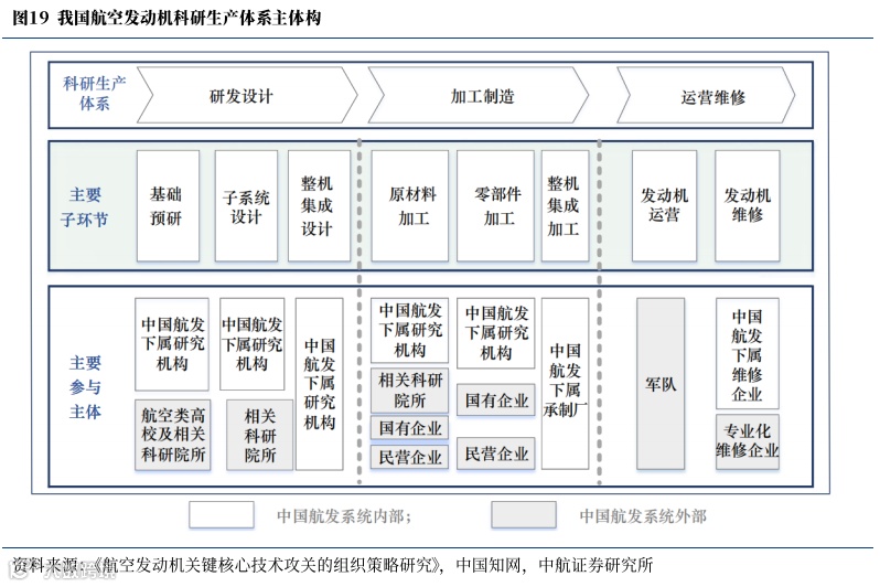 以发动机设计研究院所和主机生产企业为核心,建成一批专业化配套生产企业和科研所共同组成的航空发动机研制生产体系。2016年成立中国航发集团,实现飞发分离发展。我国航空发动机研制体系专业覆盖度广,建有多个国防科技重点实验室,创新中心,研发中心等,形成了完善的研发生产体系。