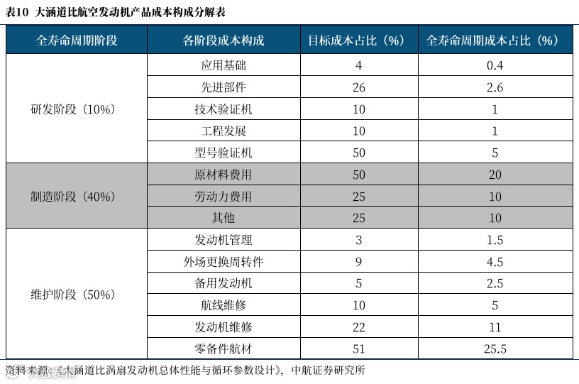 航空发动机全寿命周期要经历研发、制造、使用维护三个阶段。研发阶段又分为预先研究阶段和型号研制阶段。在全寿命周期中,研发、制造、维护的比例分别为10%—20%、40%、50%左右。在和平时期,由于武器系统服役的时间更长,发动机的寿命达到15—25年,维护费用在发动机整个生命周期内的总费用占比越来越大。