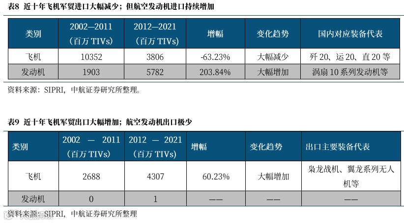 ② 国产替代:航空发动机仍为军贸进口最大品类,存在进口替代空间;此外,部分产品有望实现军贸出口