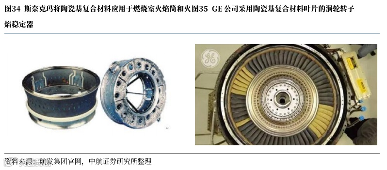 与高温合金和单相陶瓷相比,陶瓷基复合材料的优势有:密度低,仅为高温合金的1/4—1/3;具有很好的耐高温能力,只需较少气体冷却或根本不需要冷却;具有较高的氧化稳定性,使用该材料的高温部件可以不使用昂贵且沉重的隔热涂层或氧化保护涂层。陶瓷基复合材料主要应用于发动机的燃烧室、高压涡轮、低压涡轮和喷管等部件上。