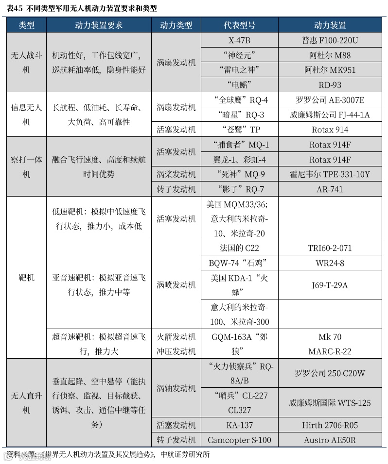 无人战斗机要求动力装置工作包线宽广,加、减速性能好,巡航耗油率低,隐身性能好,一般采用涡扇发动机。信息无人机往往具有高空、长航时特点,一般采用涡扇发动机或活塞发动机。小型低空无人侦察机动力装置功率小,但要求其质量小,加工成本低,一般采用活塞发动机。察打一体机既要侦察、监视,也要实施电子战、实弹攻击等任务,动力装置需融合速度、高度、续航和隐身优势,一般采用涡轮增压活塞发动机,也可以采用涡桨发动机和转子发动机。靶机可以分为低速靶机、亚音速靶机和超音速靶机,其中低速靶机一般采用活塞发动机,亚音速靶机一般将涡喷发动机作为首选动力,而超音速靶机一般采用火箭发动机和冲压发动机。无人直升机作为旋翼机,其动力要求较为特殊,涡轴发动机具有功重比大、结构紧凑、振动小、高原性能好、燃料适用性好、便于维修等优点,成为直升机的主要动力装置。重量较轻的无人直升机也可以采用或活塞发动机或转子发动机。