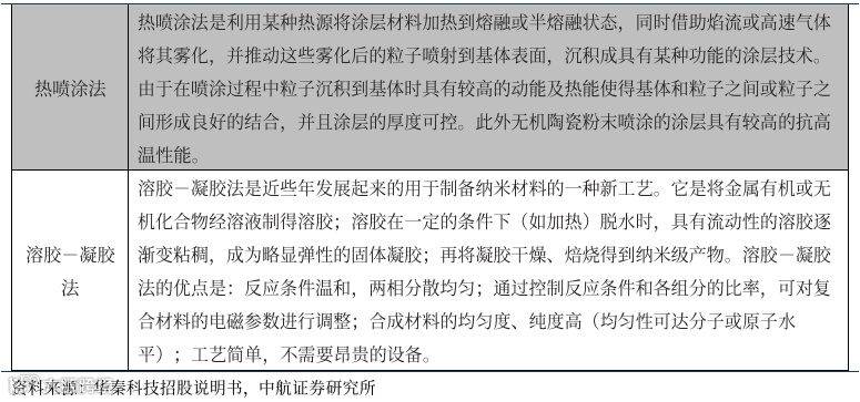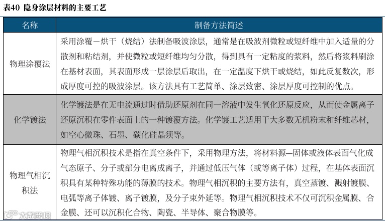 不同隐身材料工艺也大不相同。从两种主要成型工艺的隐身材料(隐身涂层材料和结构隐身材料)来看:隐身涂层材料的主要工艺包括物理涂覆、化学镀、物理气相沉积、热喷涂和溶胶-凝胶技术等。