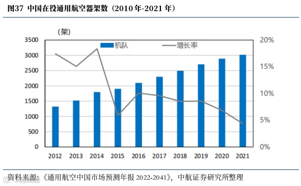 中国通航机队规模稳步增长,截至2021年末,中国通航在役机队规模达到3018架,较上一年度新增126架。近十年,我国通航机队规模平均增速为10.5%。我国通航市场以活塞通用飞机为主,机队规模为1552架,占整体的51.4%。直升机、涡桨通用飞机和喷气公务机机队规模分别为886架、293架、198架,此外,电动飞机数量为7架。