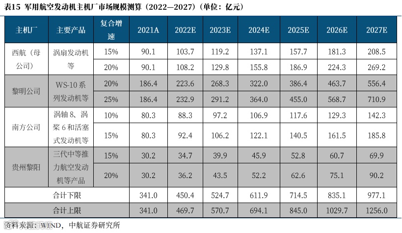 根据党的十九届五中全会明确提出确保2027年实现建军一百年奋斗目标,形成了到2027年、2035年、本世纪中叶,近、中、远目标梯次衔接的新“三步走”战略安排。我们将中短期测算的维度放在2022年—2027年,根据不同的主机厂对应的机型发展进行预测,预计至2027年,军用航空发动机的市场规模约为977亿元—1256亿元。