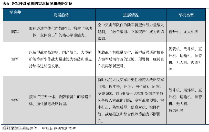 在陆军加速迈进立体化作战时代、海军要求以航母等新型作战力量建设为突破、空军加速“空天一体、攻防兼备”战略转型之际,军机都将扮演关键角色。与此同时,随着未来战争将实现陆、海、空、天、网、电的多军种多领域的深度联合作战,军机将成为关键枢纽和节点,在各军种内承担核心作战及协同任务,重要性不断提升。