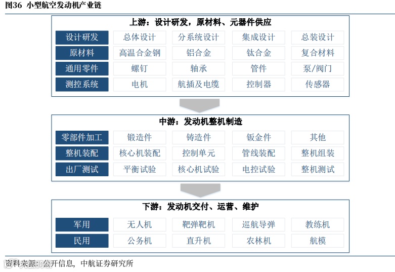 产业链的中游为单元体制造和发动机整机装配,包括发动机原料及零部件采购与组装、发动机关键零部件加工制造,以及发动机整机装配和出厂测试。航空发动机产业为主承包商-供应商发展模式,发动机主机厂的身后则有一列长长的供应商名单,将大量的生产工作甚至一些零部件/子系统的研发工作转包给供应商。产业链的下游为发动机交付和运营、维修,小型航空发动机主要服务于无人机、通用航空、巡航导弹等领域。发动机零部件更换及维修。军用主要由军队相关单位提供维修保障,民用则由运营单位进行日常维护,以及由交付单位提供返厂大修和回收报废。
