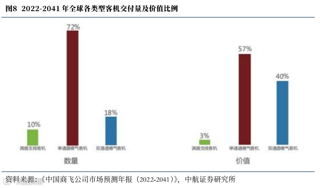 根据中国商飞预测,2022—2041年,预计全球将有30367架单通道喷气客机交付运营,其中67.8%为中型单通道喷气客机。单通道喷气客机机队的年均增长率为4.3%,可供座位数的年均增长率为4.6%,平均座位数将从165座增至175座。