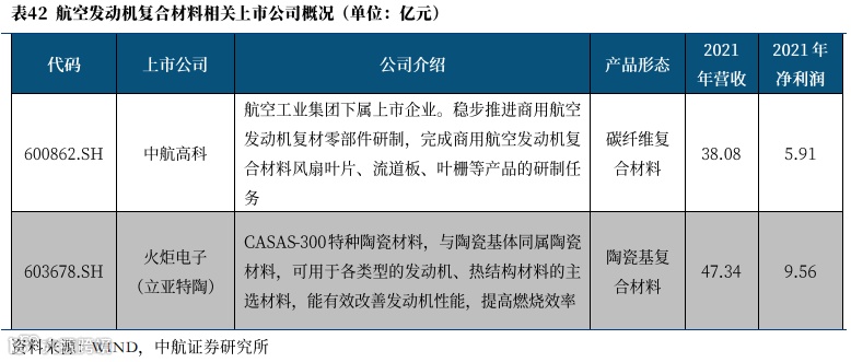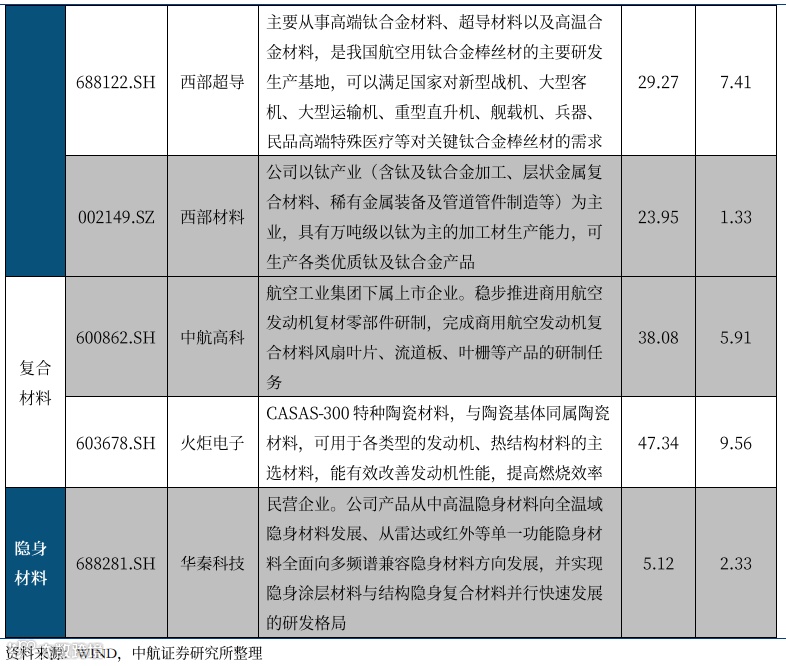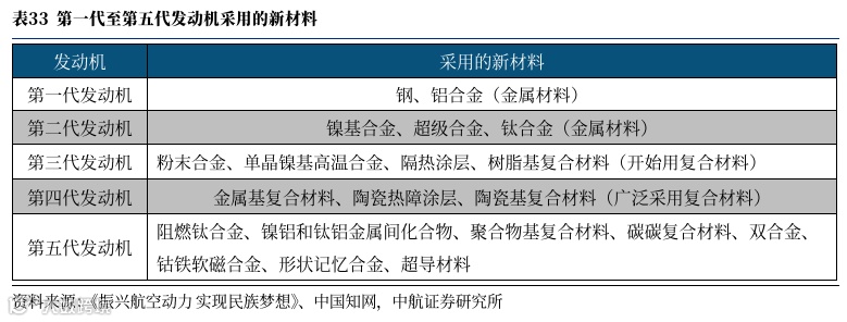 新材料是航空动力技术进步的重要基础,是提高军用航空发动机推重比的主要突破口。主要有:树脂基复合材料、纤维增强的钛基材料、耐高温合金材料、陶瓷基复合材料、碳-碳基复合材料等。通过采用新材料,在保证其耐高温性、高强度的前提下,减轻发动机质量。此外部分特种材料如隐身材料、热障涂层材料等,部分高校、科研院所、企业等已经开始布局,取得产业化突破的企业将具备较大的先发优势。