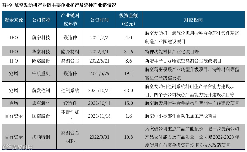 为应对下游快速增长的需求,航空发动机企业纷纷寻求资本市场支持,启动扩产,行业呈现如火如荼保交付的大好局面。同时,部分企业联合主机厂或围绕主机厂延伸新业务。如航发动力与钢研高纳共同出资设立西安钢研高纳航空部件有限公司,用以承接航发动力外协订单,实现双赢局面;图南股份在沈阳设立子公司,开展航发零部件业务。