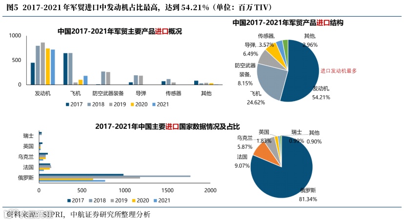 从军贸数据来看,中国2017年—2021年军贸进口中发动机占比最高,达到54.21%,仍旧是我国军贸进口的主要品类。