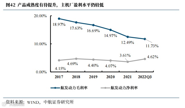 虽然我国航空发动机取得了一系列令人瞩目的成就,新产品陆续定型量产,但以航发动力为代表的的主机厂盈利能力和利润率并不高,尤其近五年,毛利率呈现下滑的趋势,呈现增收不增利的局面,净利率与国外相比也明显偏低,以2021年为例,航发动力净利率仅为3.61%,而GE航空净利率为13.52%、赛峰集团则达到了18.04%。随着公司产品成熟度提升,成本工程取得成效,规模效应显现,主机厂盈利能力有望提升,为业绩带来较大的弹性。
