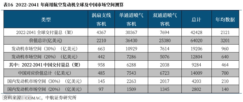 商用航空发动机市场空间方面,结合中国商飞于2022年11月发布的未来20年商用航空飞机市场预测,我们预计2022—2041年全球市场未来20年民用航空发动机市场规模为12804—19206亿美元,年均市场规模为464—640亿美元,其中中国市场未来20年民用航空发动机市场规模为2802亿美元—4203亿美元,年均市场规模为140亿美元—210亿美元。