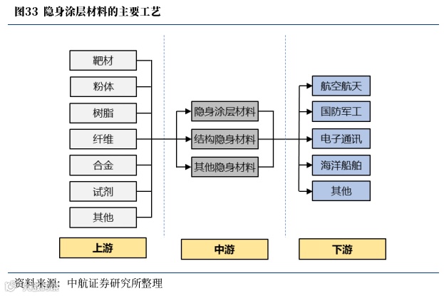 隐身材料是具有隐身功能材料的一种统称,产业链上游主要是相关原材料,如靶材、粉体、树脂、纤维、合金及试剂等,中游为隐身材料的制备商,下游为具体的应用领域,主要还是国防军工的武器装备方面。