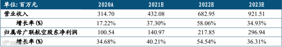 基于以上观点,考虑到收购完成后,广联航空将持有成都航新70%股权,合并报表后我们预计广联航空2021-2023年的营业收入分别为4.32亿元、6.83亿元和9.22亿元,归母净利润分别为1.41亿元、2.18亿元、2.97亿元,EPS分别为0.671元、1.036元、1.412元,我们给予“买入”评级,目标价格50.33元,分别对应75倍、49倍及36倍PE。
