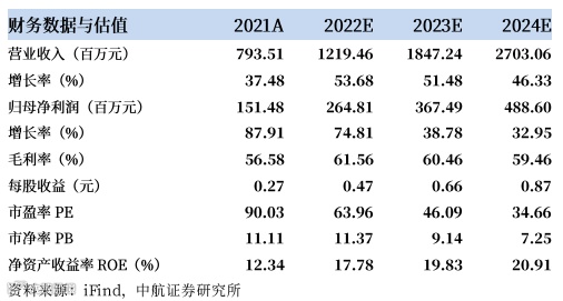基于以上观点,我们预计公司2022-2024年的营业收入分别为12.19亿元、18.47亿元和27.03亿元,归母净利润分别为2.65亿元、3.67亿元和4.89亿元,EPS分别为0.47元、0.66元和0.87元。我们维持“买入”评级。