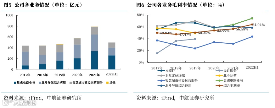 公司围绕北斗卫星导航、核心电子元器件方向,主要从事北斗卫星导航“元器件-终端-系统应用”全链条核心产品研发、生产及销售运营,集成电路设计、开发及销售,以及视频光电、安防监控等智慧城市建设运营服务业务。分业务看,公司主要业务板块包括集成电路业务板块、北斗导航综合应用业务板块及智慧城市建设运营服务业务板块。