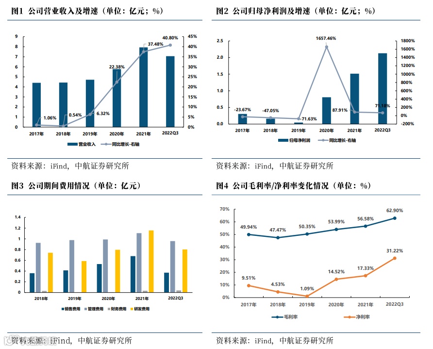 2022年前三季度报告期内,公司现营收7.06亿元(+40.80%),归母净利润2.13亿元(+71.18%),扣非归母净利润1.68亿元(+113.92%),毛利率62.90%(+5.71pcts),净利率31.22%(+6.64pcts),整体业绩持续向好,盈利能力不断提升。