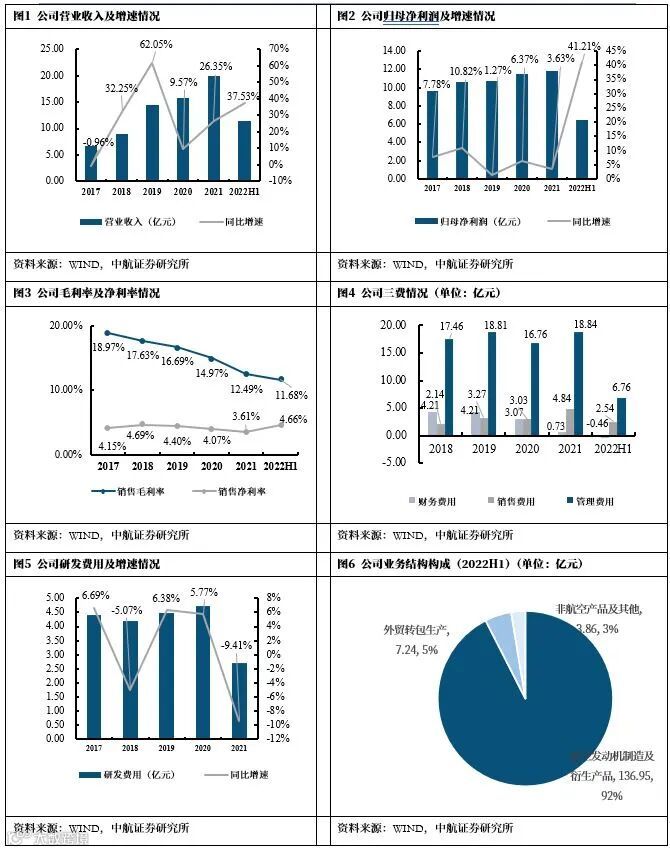 公司的主要业务为包含三类,航空发动机制造及衍生产品、外贸转包、非航产品收入及其他。其中,航空发动机制造及衍生产品营业收入额136.95亿元(+50.05%),营收占比92.50%;外贸转包生产营业收入7.24亿元(+20.92%);非航空产品及其他业务营业收入1.37亿元(-35.12%),传统的非航业务市场竞争力不强,面临较大的压力,后续公司将对低附加值产品将采取收缩战略。