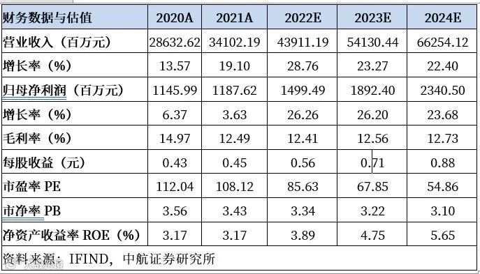 我们预计公司2022-2024年的营业收入分别439.11亿元、541.30亿元和662.54亿元,归母净利润分别为14.99亿元、18.92亿元及23.41亿元,EPS分别为0.56元、0.71元、0.88元,我们维持买入评级,目标价65.00元。