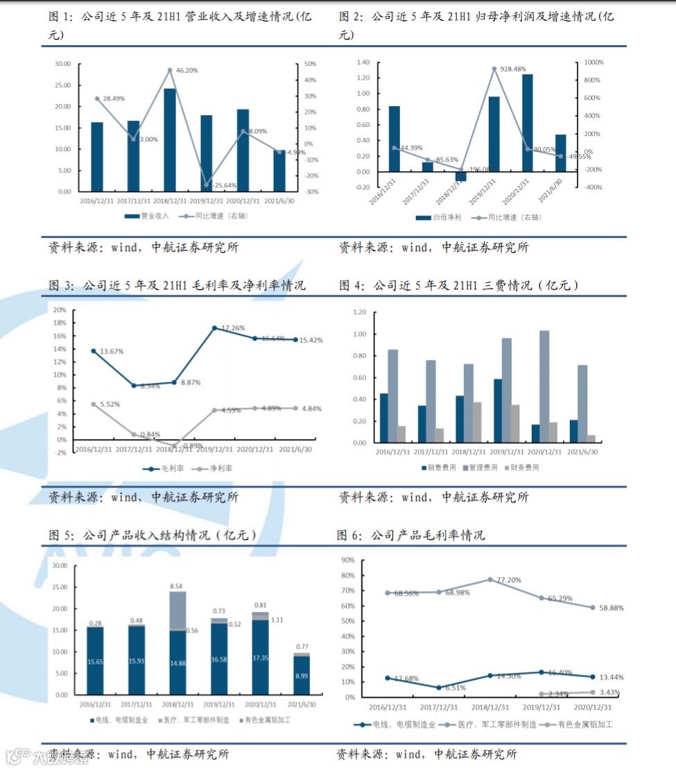分业务板块来看,报告期内电线电缆制造业务实现营业收入8.99亿元(-4.78%),在营收中分别占比为92.10%(+0.20pcts);报告期内,电线电缆业务毛利率为11.81%(-3.42pcts),电线电缆业务毛利率有所下滑主要是由于近半年来铜铝等原材料价格相较去年同期大幅上涨(截至2021年7月30日分别较年初提升23.48%/27.21%),侵蚀了公司电缆业务较大的利润,从而对该部分业务盈利能力有一定程度影响;