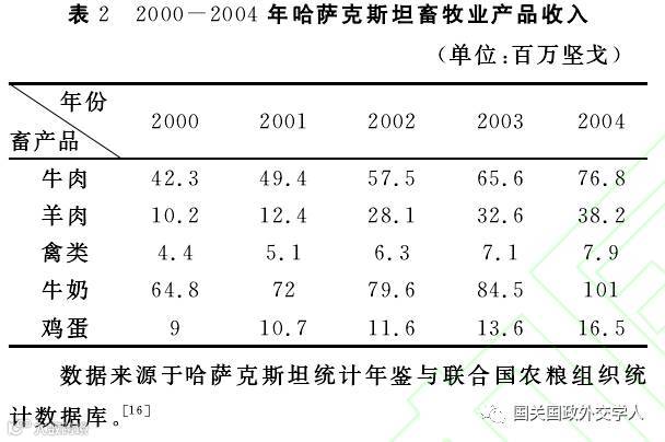 AFP促进畜牧业发展的效果同样是显著的。在此期间,畜牧业获得的财政预算从2000年的1亿坚戈增长至2004年的14.89亿坚戈。从牲畜的存栏数来看,2004年牛的存栏数比2000年增长850000头,2004年羊的存栏数比2000年增长2526000头。2005年,牛、羊肉产量共计107万吨,比2000年增长10万吨。表2是2000一2004年哈萨克斯坦畜牧业主要产品创收数据。