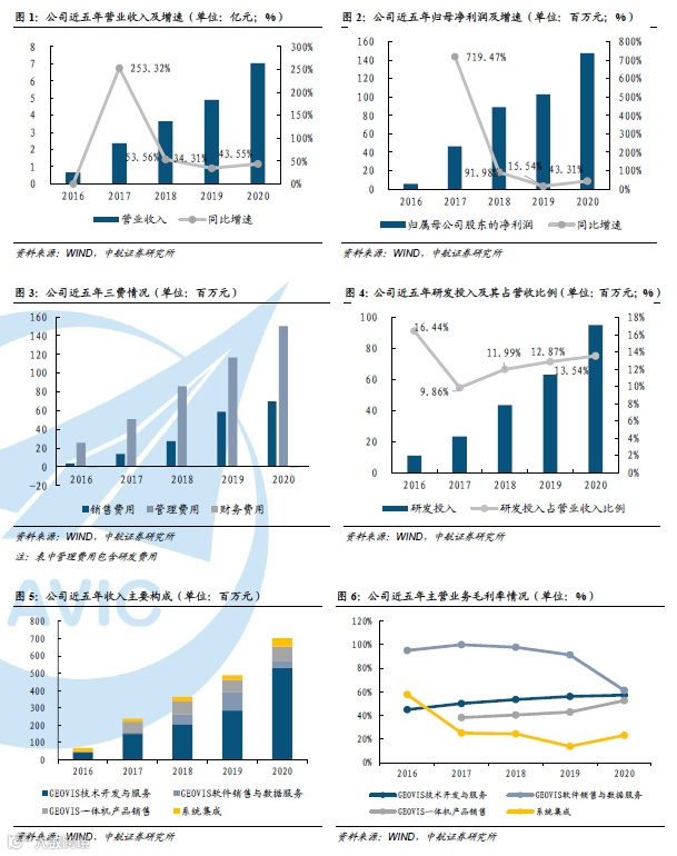 从产品上看,公司主要产品为GEOVIS技术开发与服务、GEOVIS一体机产品销售、系统集成、GEOVIS软件与数据服务。其中,GEOVIS技术开发与服务业务是公司近年来收入的主要构成,2020年,受益于产品订单持续增长,公司在该业务上的收入(5.32亿元,+86.73%)大幅增长,这也是公司2020年整体业绩快速增长的主要原因。同时,公司系统集成业务收入(0.47亿元,+72.81%)也出现大幅增长,我们认为主要系公司加大了市场拓展力度,同时地理信息产业市场需求有所增长所致。而在公司四大业务板块中,GEOVIS软件与数据服务业务的收入(0.41亿元,-61.78%)与毛利率(61.23%,-30.02pcts)同时出现大幅度下滑,我们认为,主要原因包括两方面,一方面是公司2020年数据服务种类增加,数据需求增加,导致数据采购种类增加以及数据采购综合成本上升所致,另一方面,收入下滑较大可能与相关项目的周期与收入确认时点存在波动有关。