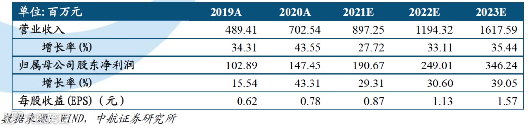 基于以上观点,我们预计公司2021-2023年的营业收入分别为8.97亿元、11.94亿元和16.18亿元,归母净利润分别为1.91亿元、2.49亿元、3.46亿元,我们给予目标价格57.10元,对应2021-2023年的PE为66倍、50倍、36倍。
