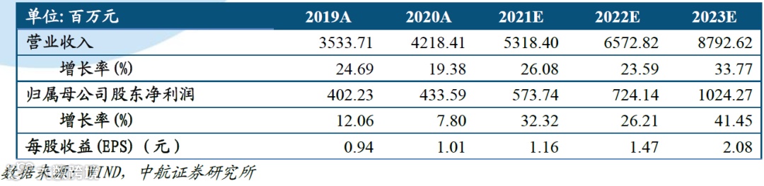 基于以上观点,我们预计公司2021-2023年的营业收入分别为53.18亿元、65.73亿元和87.93亿元,归母净利润分别为5.74亿元、7.24亿元、10.24亿元,当前股价对应2021-2023年的PE为39倍、31倍、22倍。