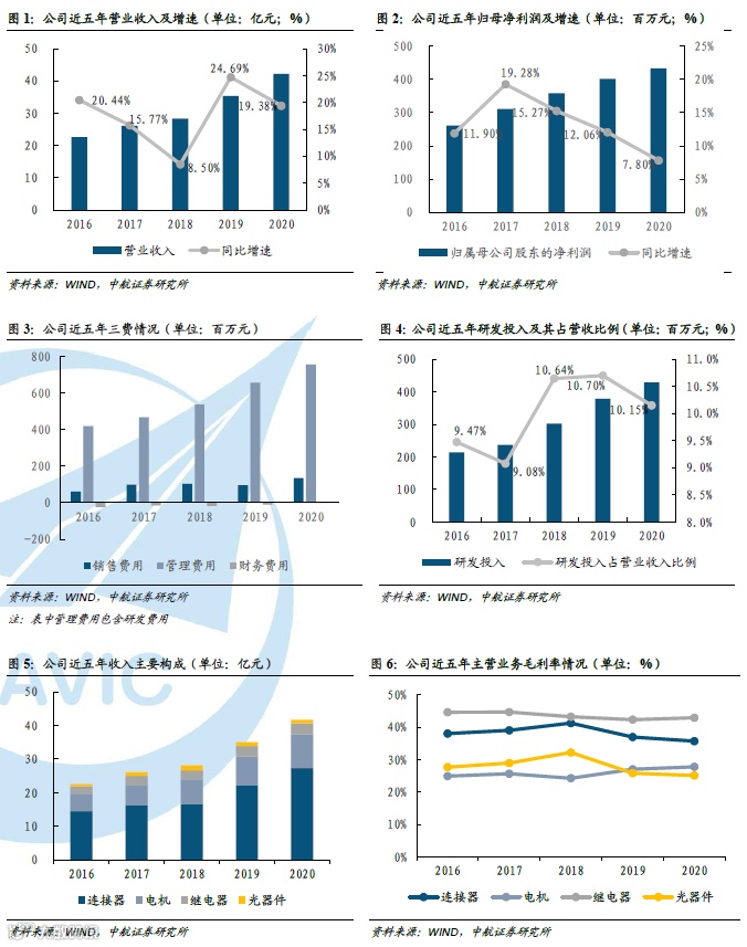 具体来看,2020年,公司连接器与电机产品收入分别为27.28亿元(+23.15%)与10.10亿元(+17.28%),均保持了稳定的增长,由于公司产品生产主要采取以销定产的模式,从2020年公司连接器与电机的产量均超过销量(库存量分别增长19.98%以及15.20%)来看,公司连接器与电机的订单或较为充足,有望在2021年兑现至利润表;而在2020年公司特种继电器产品订单与收入有所增长背景下,公司继电器业务收入(3.20亿元,+2.21%)增速却较2019年增速(13.94%)有所放缓,继电器产品的销量与产量也分别下滑27.15%与42.07%,主要系公司家电用继电器产品市场需求下滑,导致相关产品导致订单与收入下降所致;另外,2020年公司光通信器件产品收入(1.15亿元,-1.49%)继续下滑,但下滑幅度较2019年的快速下滑(-19.62%)有所收窄,我们认为与我国5G、光通信、数据中心、物联网等领域快速发展与自主可控步伐的加快,带动了对上游光模块等光通信器件的市场需求有关。