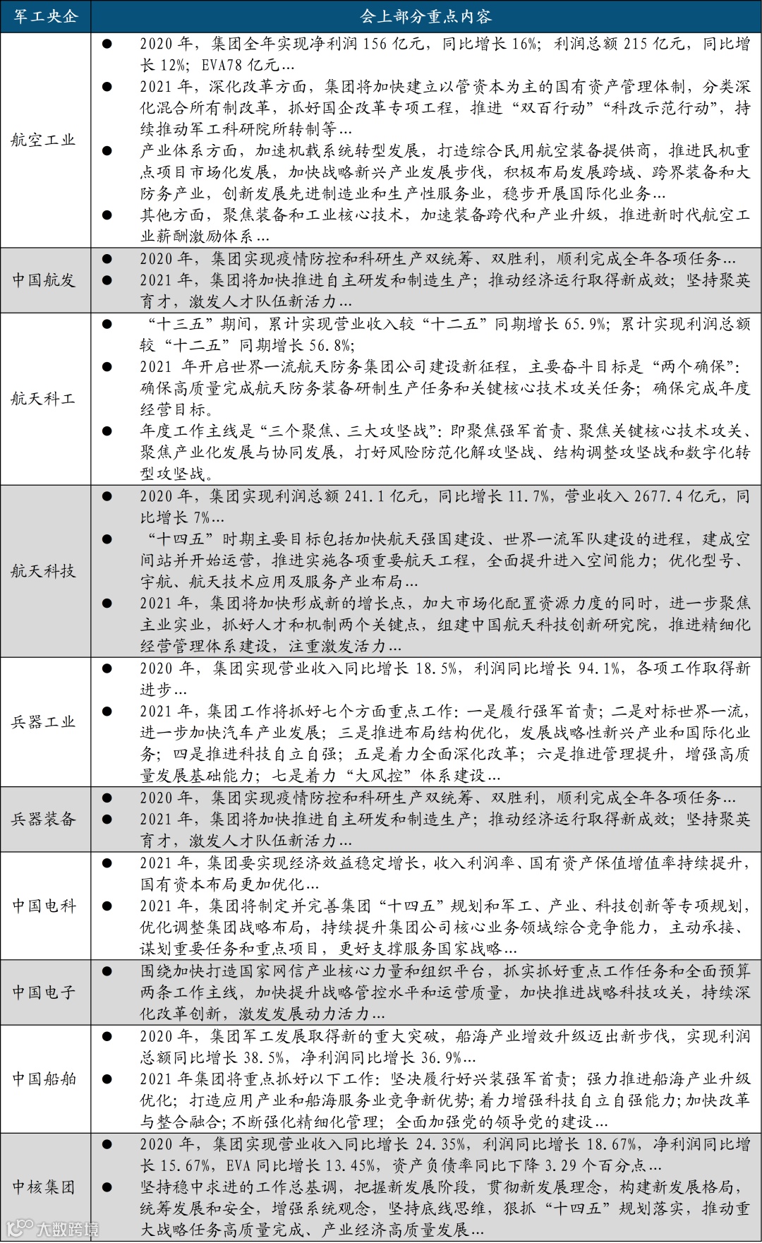 十大军工央企相继召开了2021年工作会议,在总结2020年及“十三五”工作基础上,对2021年的工作进行了部署,总体来看,以上军工央企的工作任务均在聚焦主业、加大科技自主创新、提升经营管理效率及激发人才创新活力等方面有所强调,我们认为,在“十四五”期间,十大军工央企发展路径依托于通过深化改革,实现军工产业各领域高质量发展。具体相关情况如下图所示。