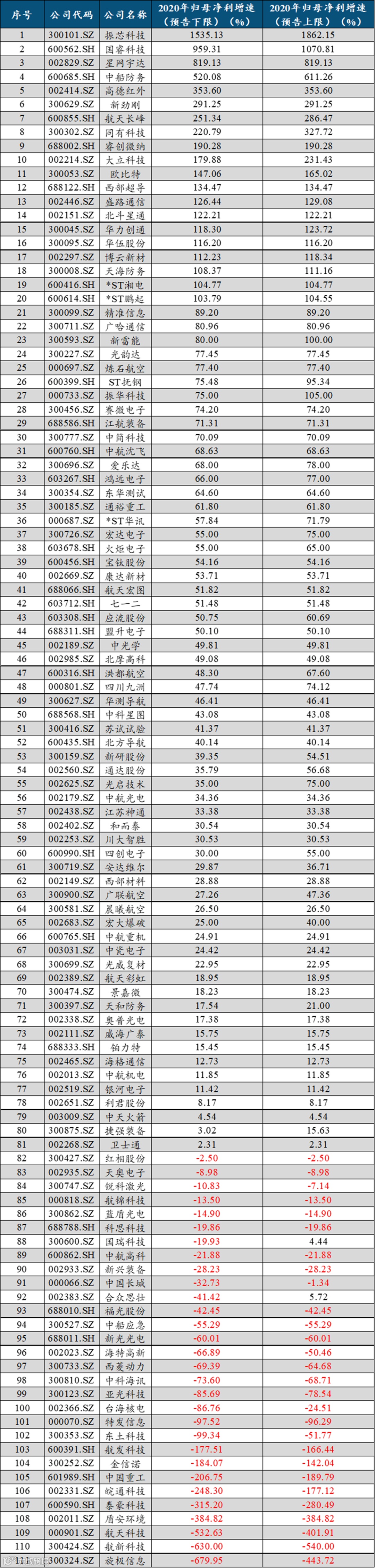 截至2021年3月19日,共有111家军工行业上市公司披露了2020年业绩预告(快报)或正式年报,81家上市公司业绩预增,不考虑资产重组的影响,振芯科技、国睿科技、星网宇达、高德红外、新劲刚、大立科技等军工信息化及原材料领域上市公司业绩增幅居前,具体如下图所示: