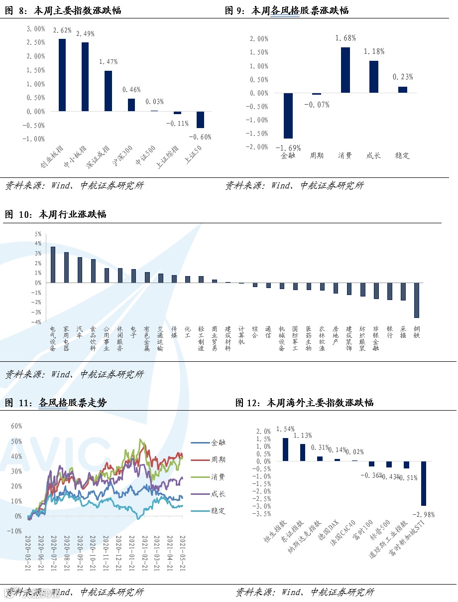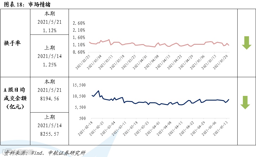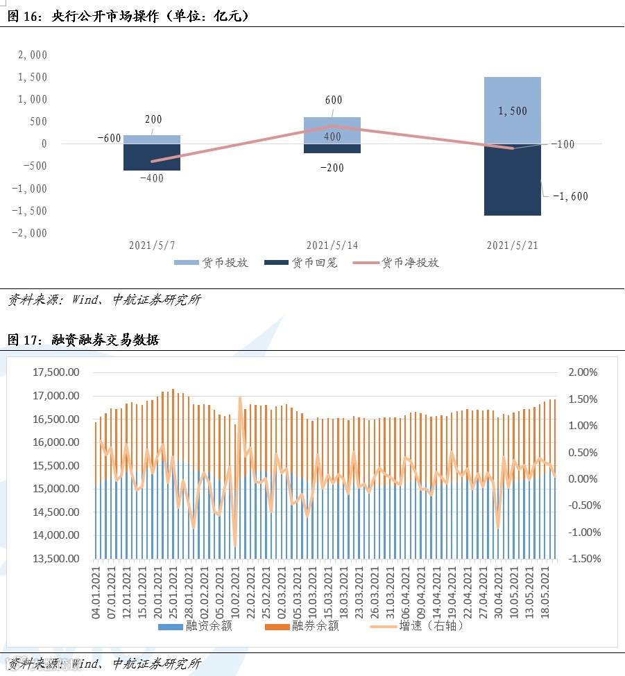 海外方面,美国5月15日当周初请失业金人数为44.4万人,预期45万人,前值自47.3万人修正至47.8万人;四周均值为50.475万人,前值自53.4万人修正至53.525万人,美国就业情况边际好转。美联储会议纪要偏鸽程度不及预期:部分官员认为,由于基数效应,通胀将在近期升至2%以上;经济前景面临的风险不像之前几个月那么高。同时,多位官员认为,如果经济继续快速增长,在即将召开的会议上“某个时候”开始讨论缩减购债规模是合适的,预示着美联储可能很快就会开始讨论放缓购买国债和抵押贷款债券,美国宽松政策终结的速度可能超出市场预期,后续仍需持续观察。