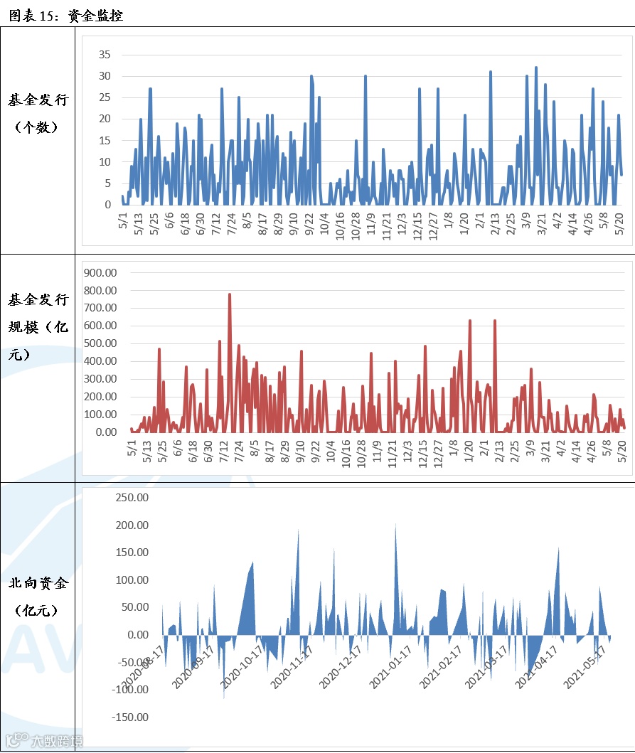 资金流向方面,北向资金本周累计净流入4.75亿元,前一期为净流入27.12亿元。本周新发行的基金个数为58个,上周为53个;本周基金发行规模为330.92亿元,上周为353.62亿元。2021年5月份截至5月21日IPO募集资金为198.62亿元,增发募集资金391.08亿元。交易费用本周为83.58亿元。