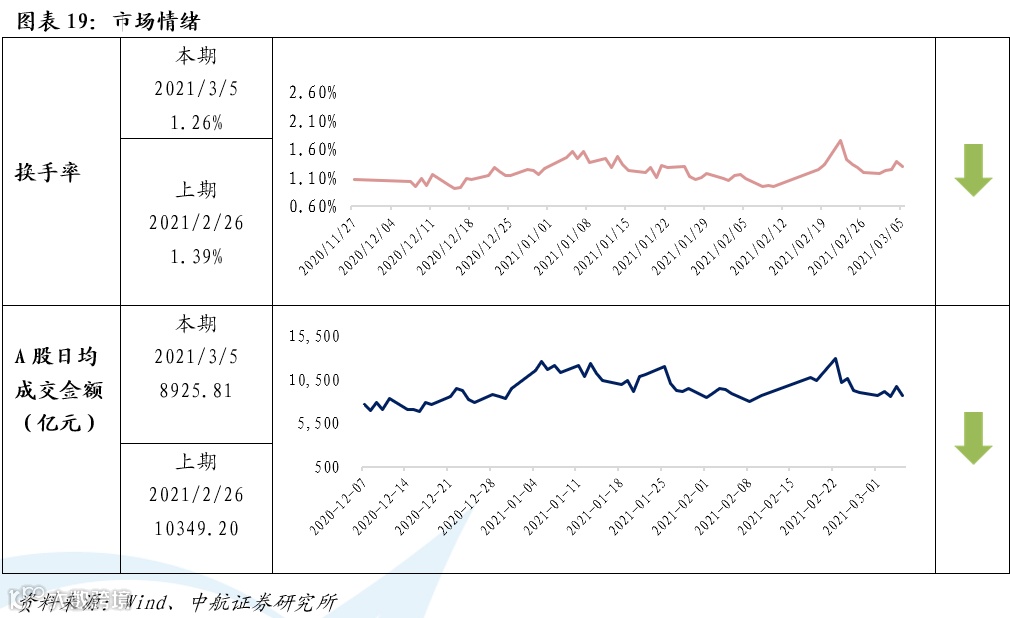 市场情绪方面,本周日均换手率为1.26%,较上周的1.39%有所下降。A股日均成交金额为8925.81亿元,较上周的10349.20亿元有明显回落。