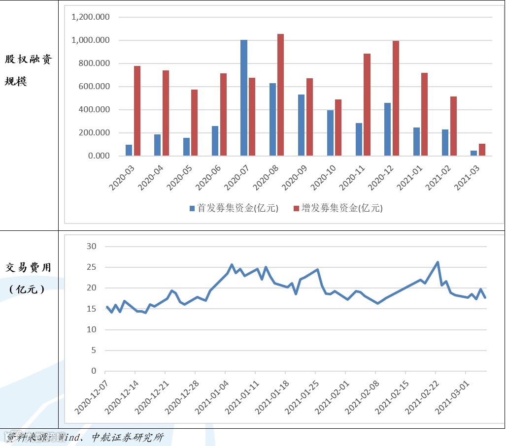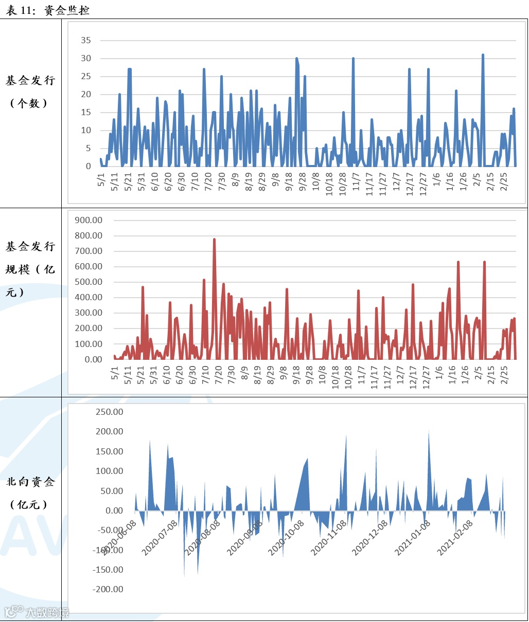 资金流向方面,北向资金本周累计净流出8.36亿元,前一期为净流出75.01亿元。本周新发行的基金个数为50个,上周为34个;本周基金发行规模为864.90亿元,上周为673.86亿元。2021年3月份截至3月5日IPO募集资金为49.32亿元,增发募集资金107.26亿元。交易费用本周为91.04亿元。