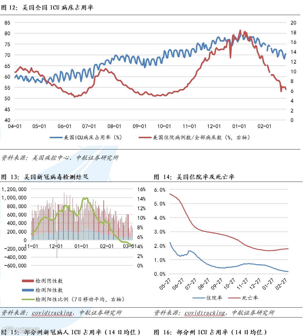 全球疫情方面,截至3月6日,全球累计感染人数已经超过1.17亿人,现有确诊人数2419万人,累计死亡人数超过267万人。美国方面,当地时间2月20日,据美国约翰斯·霍普金斯大学统计,截至美东时间5日16时25分,美国累计新冠肺炎确诊病例达28873800例,美国新冠肺炎死亡病例超52万例,达522221例。过去24小时,美国新增确诊病例62242例,新增死亡病例2293例。我们对美国ICU病床占用率进行统计,截至2月27日美国全国ICU占用率为70.48%,自疫苗大规模接种以来持续下降,即将脱离我们之前提出的70%-80%警戒值下限,美国全国病床利用率为6.30%,已经脱离我们提出的15%-30%警戒值。我们对美国各州进行单独统计,新冠病人ICU占用率排名靠前的各州的新冠病人ICU占用率14日平均值均已全部低于30%,较此前大幅下降,排名第一的俄亥俄州该指标达为26.47%;ICU病床总占用率14日均值,超过80%的州为排名前5个,此前为4个,我们统计的美国五十个州和三个特区或领地中有23个ICU病床总占用率超过我们提出的70%-80%警戒值。