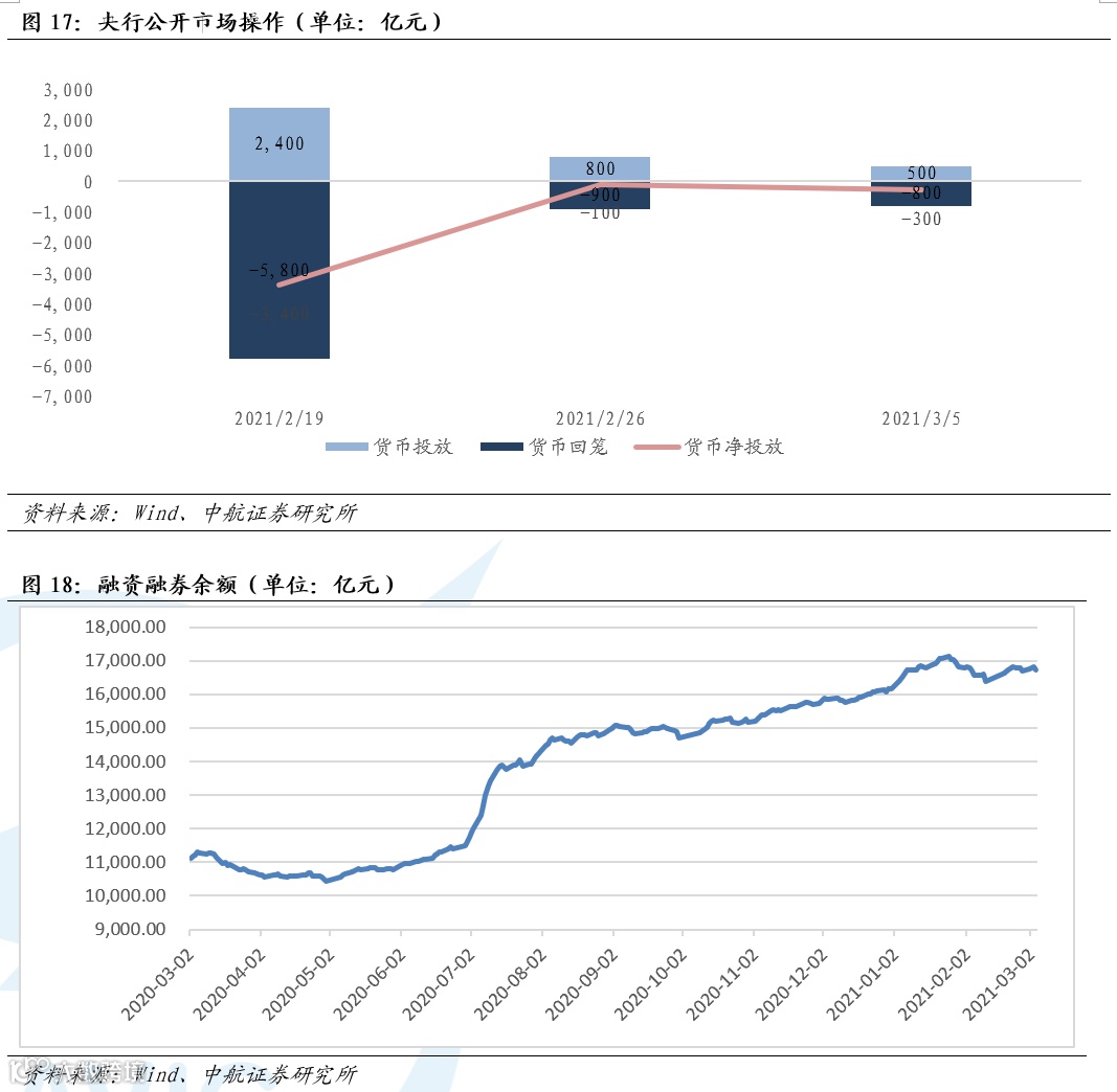 流动性方面,本周央行公开操作净回笼货币300亿元,上周为净回笼货币100亿元。两融余额为16750.24亿元,上周为16803.11亿元。