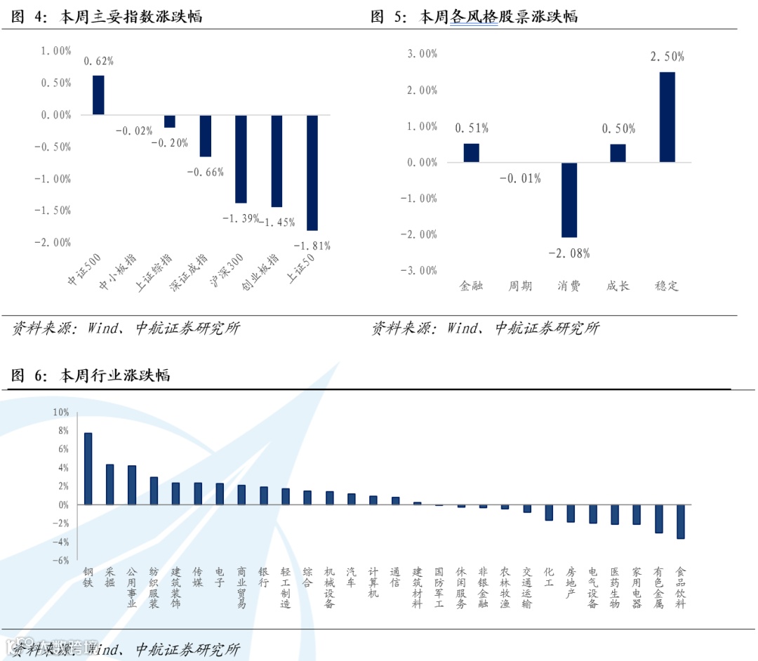 本周各大指数除中证500外均收跌,上证指数周跌0.20%;深证成指跌0.66%;创业板指周跌1.45%,沪深300指数跌1.39%,代表大市值股票的上证50指数周跌1.81%,代表中小市值股的中证500指数周涨0.62%,中小市值股票跑赢大市值股,风格切换明显。