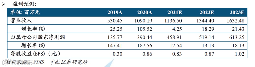 基于以上观点,我们预计公司2021-2023年的营业收入分别为11.37亿元、13.44亿元和16.32亿元,归母净利润分别为4.59亿元、5.19亿元及6.13亿元,EPS分别为0.83元、0.87元、1.02元,我们给予“买入”评级,目标价格32.96元,分别对应40倍、38倍及32倍PE。
