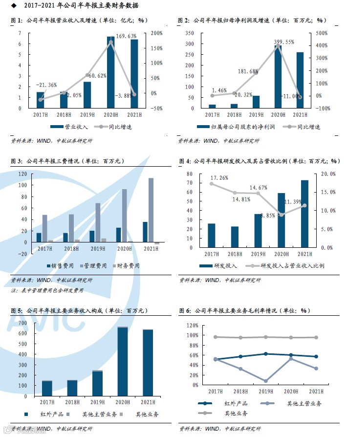 费用方面,报告期内,在公司收入略有下降背景下,公司三费费率有所提升(11.21%,+1.89pcts)。其中,销售费用率(5.56%,+1.71pcts)提升明显,主要系随着市场拓展而销售费用相应增长;财务费用率(-0.51%,-0.86pcts)下降明显,主要系报告期内公司银行借款大幅减少所致。另外,公司研发投入(0.73亿元,+23.63%)快速增长,占营收比例(11.39%,+2.53pcts)提升明显,我们认为主要原因包括公司拓展了包括光电吊舱、氧化钒技术路线非制冷红外探测器等领域,技术研发及新品开发项目有所增加,同时公司为适应非防疫类产品业务的扩张趋势,加大了研发投入等等。