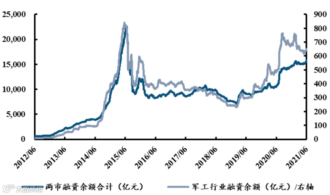 图表2:两市融资余额与军工融资余额走势情况